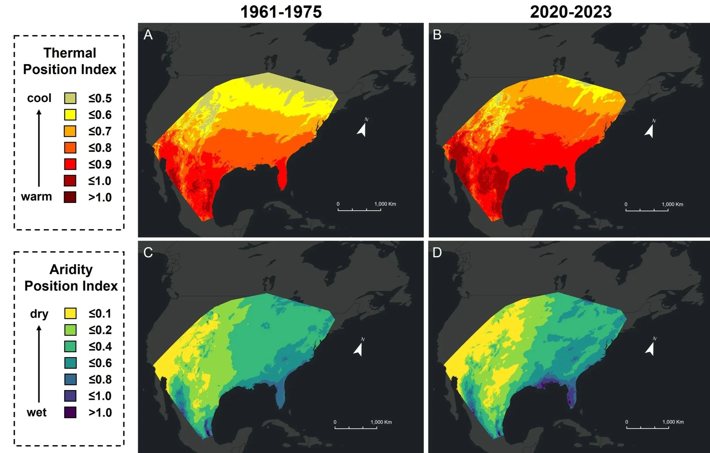 Maps of Thermal Position Index (A & B) and Aridity Position Index (C &D) over the range of Bombus pensylvanicus.